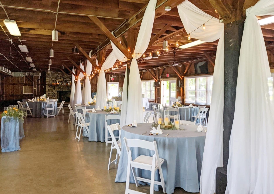 The mule barn offers a rustic charm with its 16-foot fireplace, open banquet space, built in bar, and brick patio. Our climate controlled barn measures 2,000 sq. ft. and seats around 150 guests. The Mule Barn offers exposed wood walls and ceilings, varied lighting options, and concrete floors. The interior can range from formal to casual depending on personal decor preference. There is a brick patio perfect for an indoor-outdoor combination event.